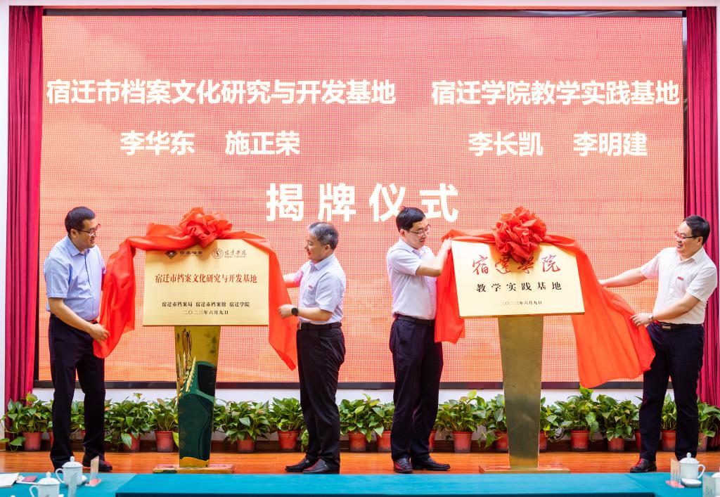 施正荣副校长代表学校与宿迁市档案馆馆长李长凯、宿迁市档案局副局长李华东共同签订战略合作协议。施正荣副校长、李明建常委分别与李华东副局长、李长凯馆长为“宿迁市档案文化研究与开发基地”“18新利luck菲律宾 教学实践基地”揭牌。