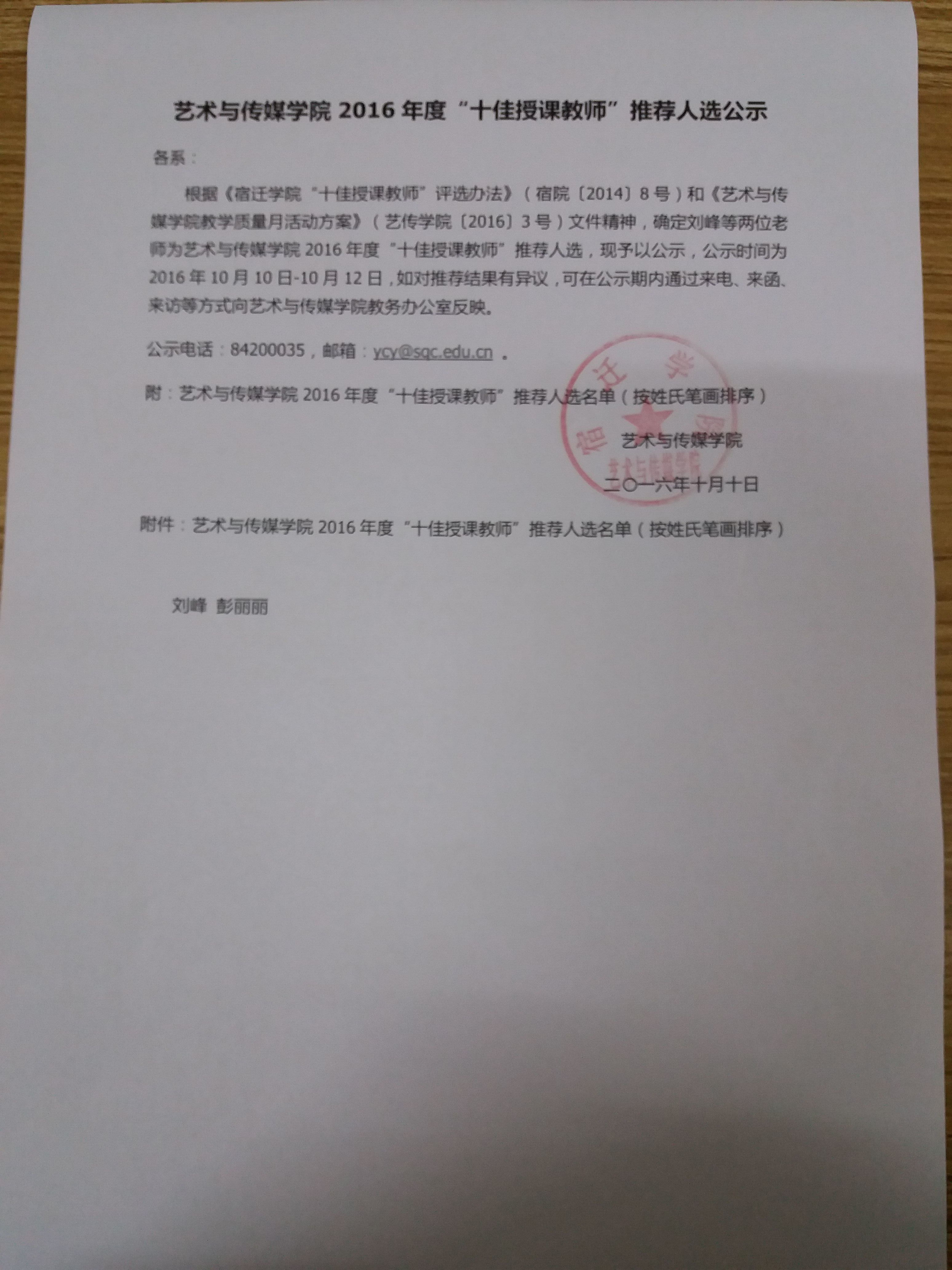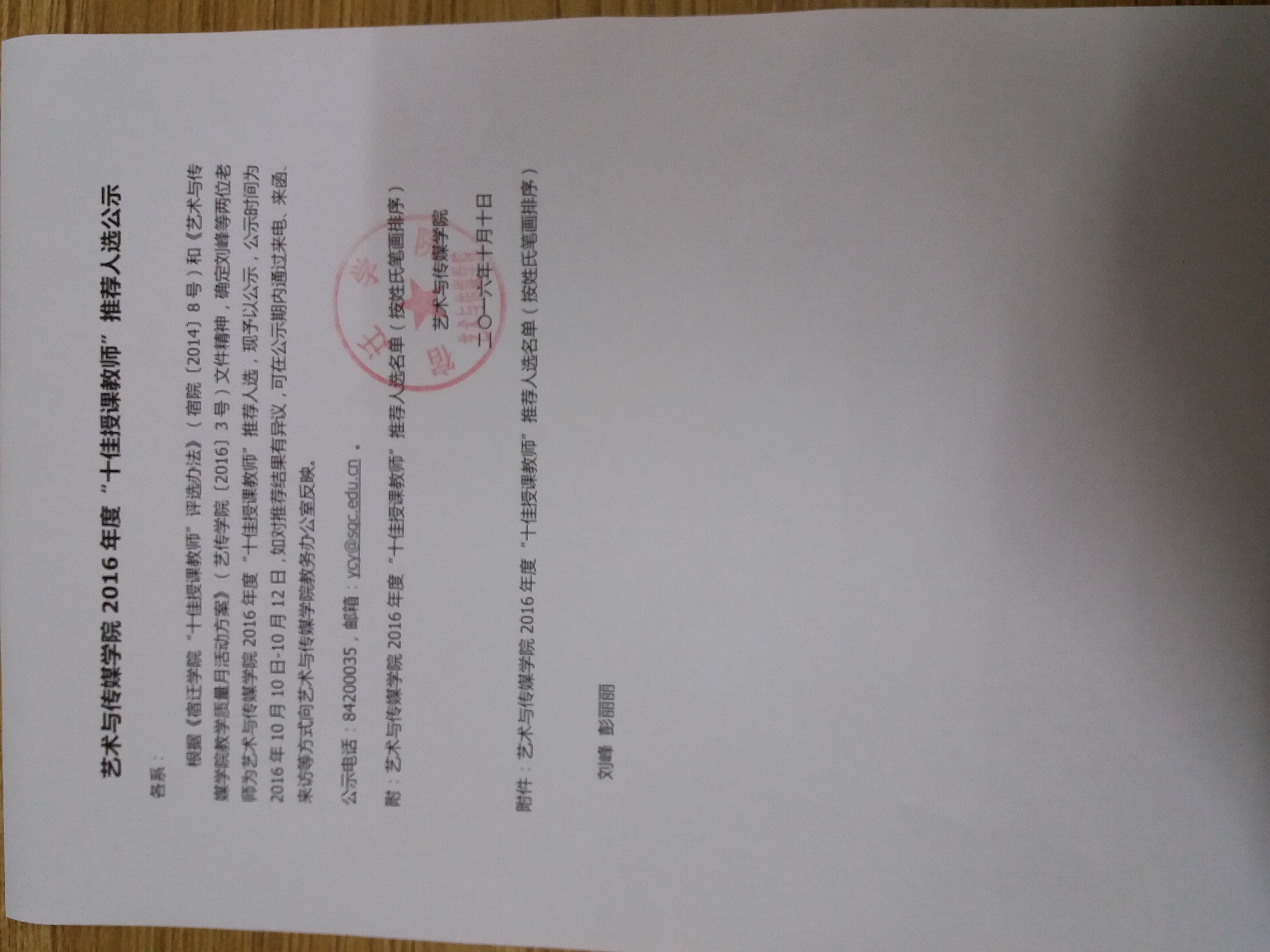 艺术与传媒学院2016年度“十佳授课教师”推荐人选公示
