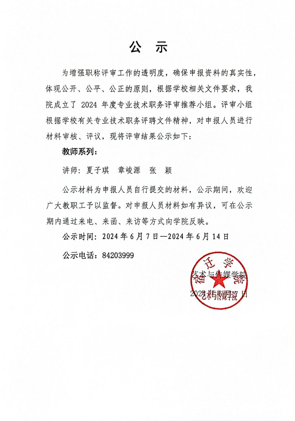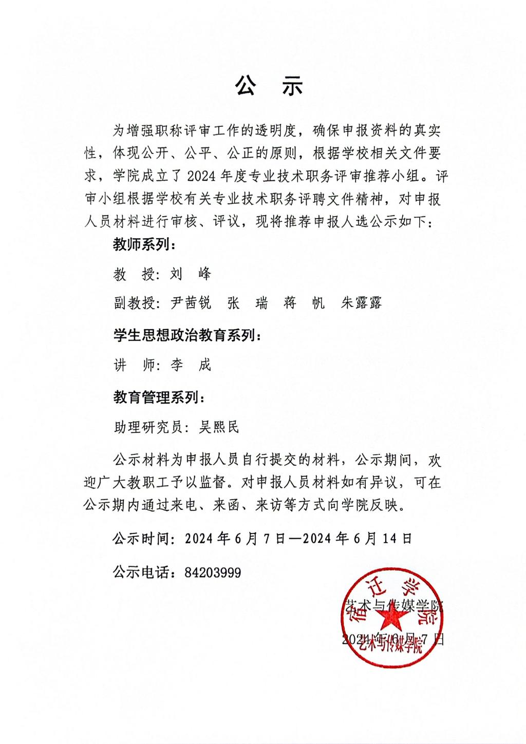 2024年度艺术与传媒学院职称评审、评议推荐结果公示