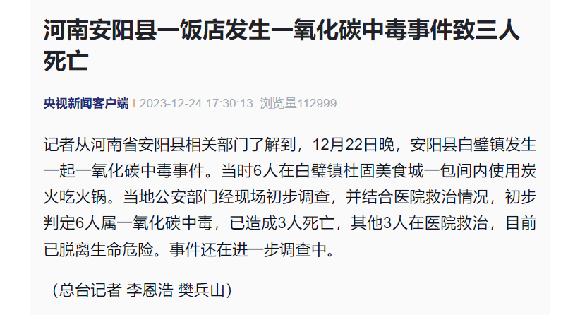 河南省安阳县白璧镇发生一起一氧化碳中毒事件