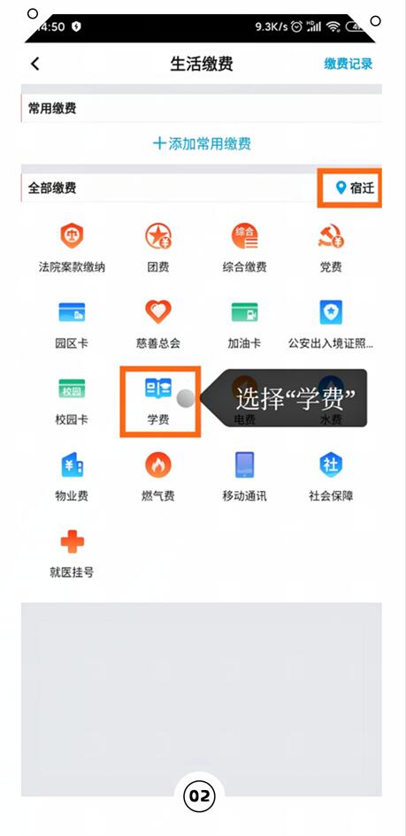 2.依次选择生活->生活缴费->学费(注意:外市学员定位在宿迁)。