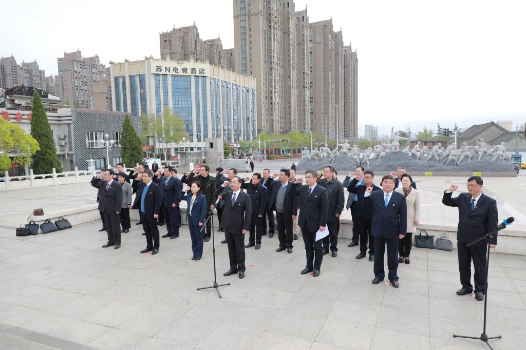 会议第一阶段在宿北大战烈士纪念塔前举行集体宣誓重温入党誓词,敬献花篮。校党委书记徐德领誓,校党委副书记、校长刘志远主持仪式。