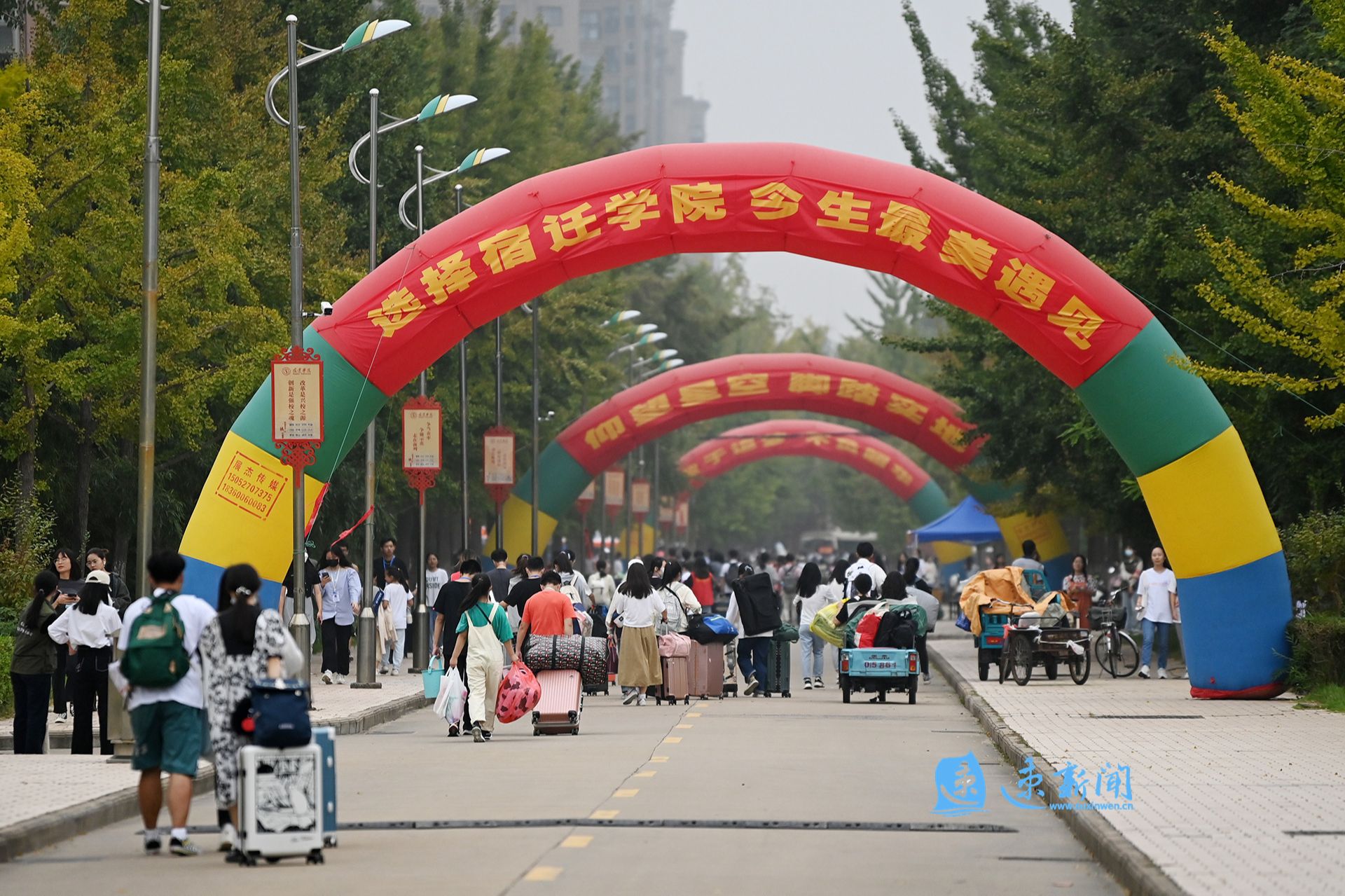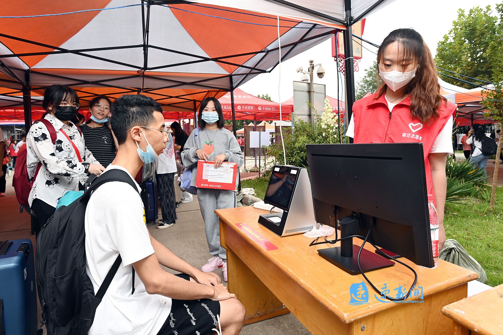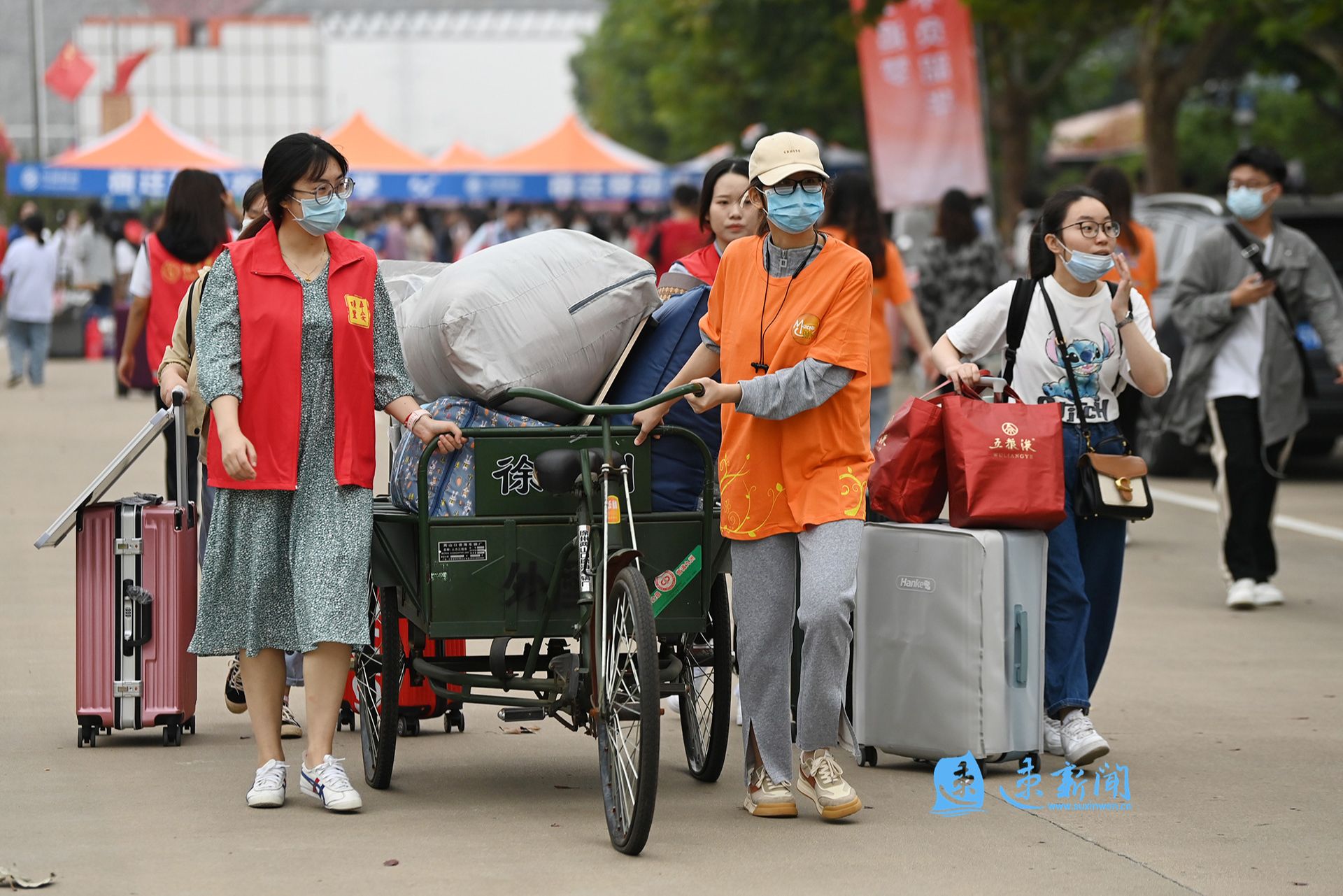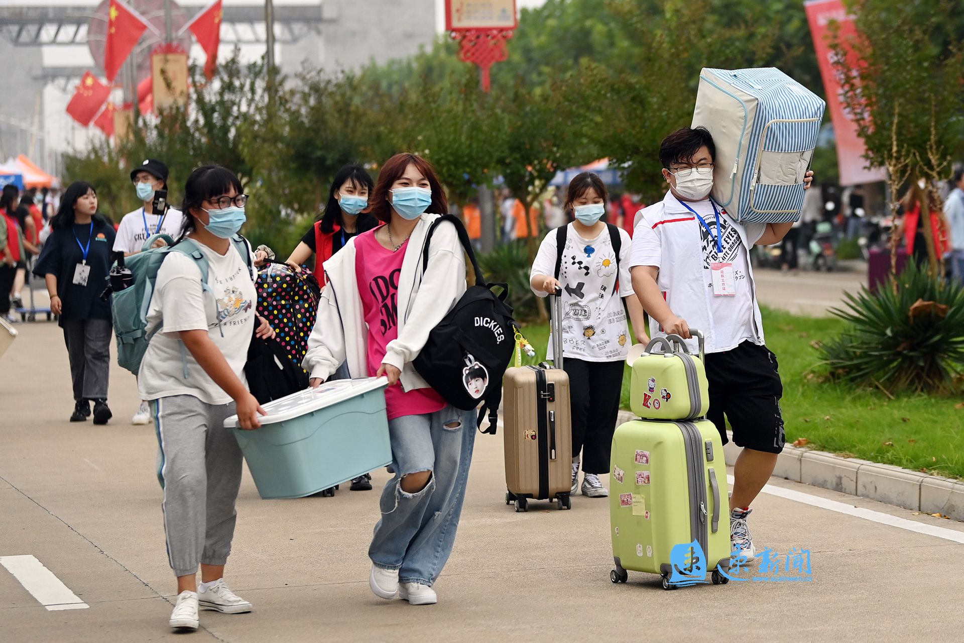 “请各位同学有序排队,保持好安全距离。”“来,我们帮你把行李拖运到宿舍。”“记得把身份证拿好,刷证进行系统报到。”……由数百名在校大学生组成的迎新志愿者队伍,往返穿梭在美丽的校园之中。他们用一张张热情的笑脸,一句句亲切的问候,一项项贴心的服务,让一抹抹亮眼的“志愿红”,成为了校园里一道靓丽风景。