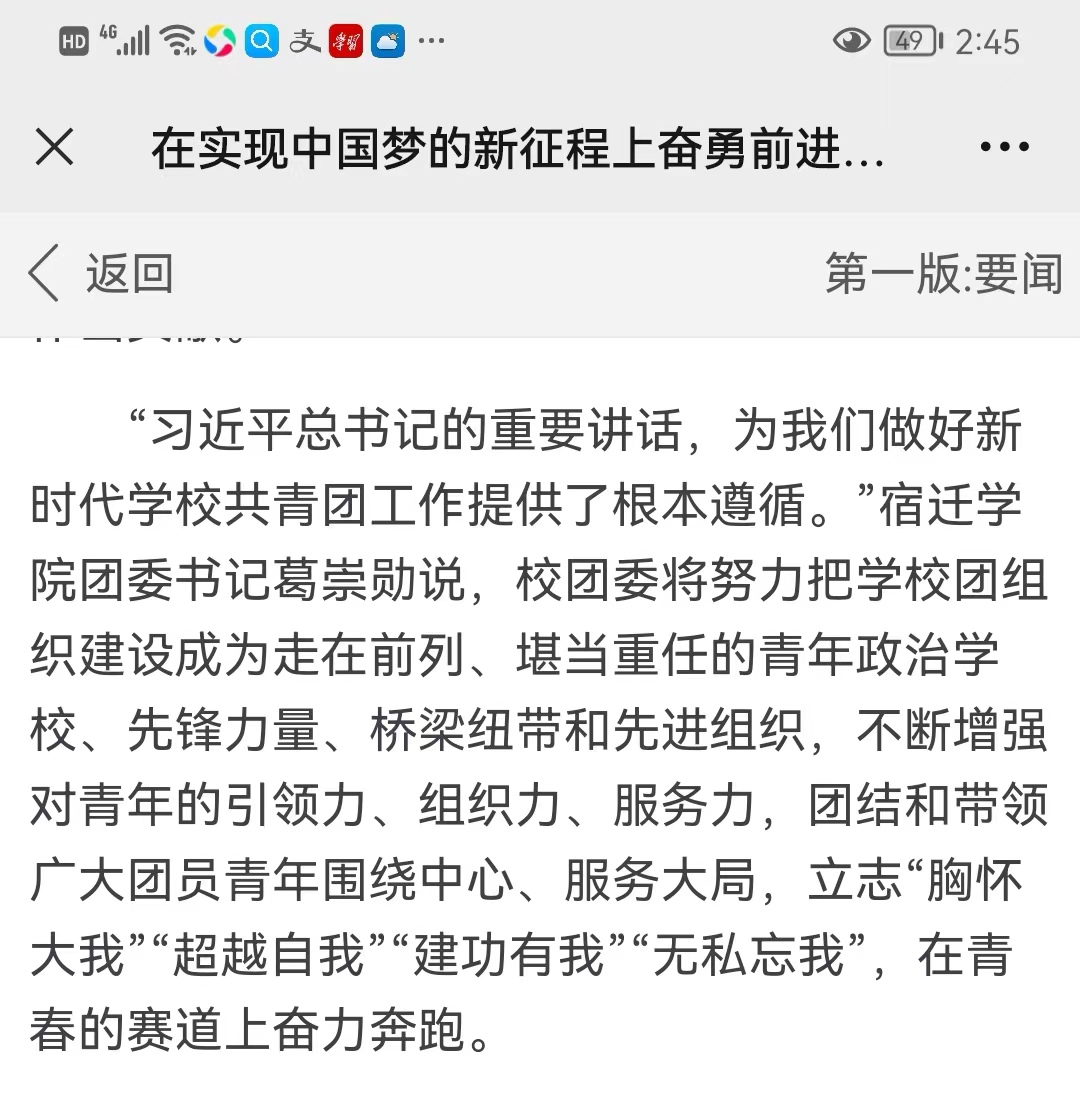 5月13日江苏教育报在头版报道我校团委学习习近平总书记在庆祝中国共产主义青年团成立100周年大会上重要讲话精神。