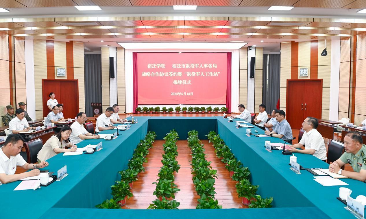 为了进一步提升退役军人服务保障水平、深化“校地合作”的层次与内涵,贯彻落实省退役军人事务厅《支持宿迁退役军人工作集成改革的意见》,6月18日上午,18新利luck菲律宾 与市退役军人事务局签署战略合作协议并举行全省首家高校“退役军人工作站”揭牌仪式。18新利luck菲律宾 党委书记徐德,省退役军人事务厅党组成员、副厅长吴晓源共同为落户18新利luck菲律宾 的全省首家高校“退役军人工作站”揭牌。18新利luck菲律宾 党委副书记、校长潘志明,市退役军人事务局党组书记、局长葛家胜代表双方签约。