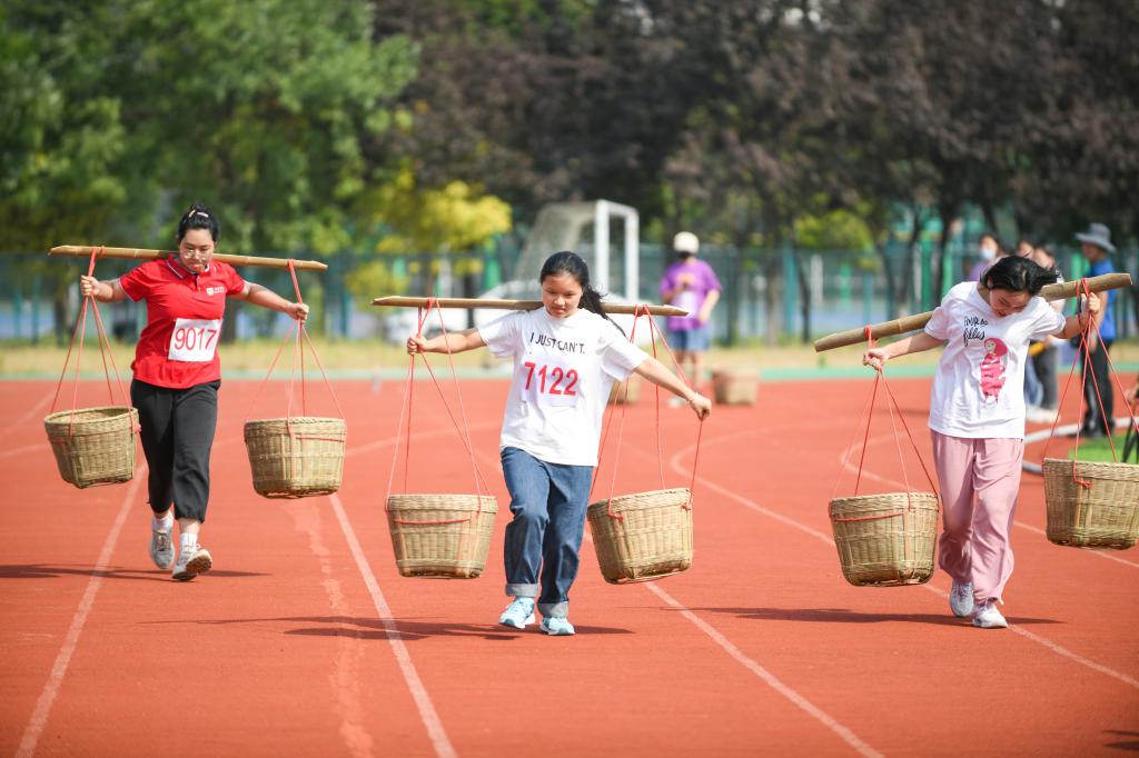 新时代劳动教育工作实施意见》,丰富大学生的校园文化生活,引导学生树立正确的劳动观,崇尚劳动、尊重劳动,增强劳动最光荣意识,促进学生德智体美劳全面发展。运动会主题是“劳动最光荣、运动最快乐”,共设置了“负重前行——拖轮胎”“运沙——挑担子”“快乐运输——推小车”“快递小哥”“扛冬瓜”“插秧”“齐心协力”“抗洪救灾”“抗旱救灾”“垃圾分类”“快乐保龄球”“废品回收”“剥花生”“包粽子”等14个项目。其中,个人项目7项,团队项目7项。