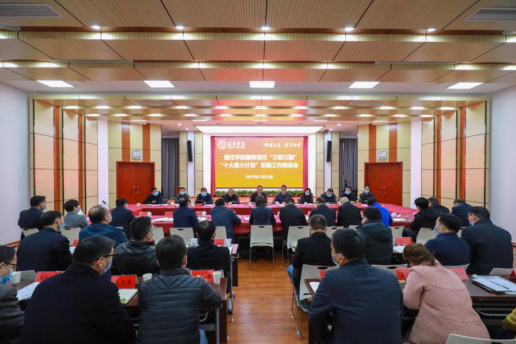 为进一步彰显学校“地方性、应用型、开放式、特色化”的发展定位,坚定不移地走进宿迁、融入宿迁、服务宿迁,努力提升服务宿迁的能力和水平,推进学校内涵建设,11月12日上午,我校在学术报告厅召开服务宿迁“三联三融”“十大星火计划”实施工作推进会。全体在校的校领导出席会议,校党委书记徐德作了讲话,校长刘志远主持会议。