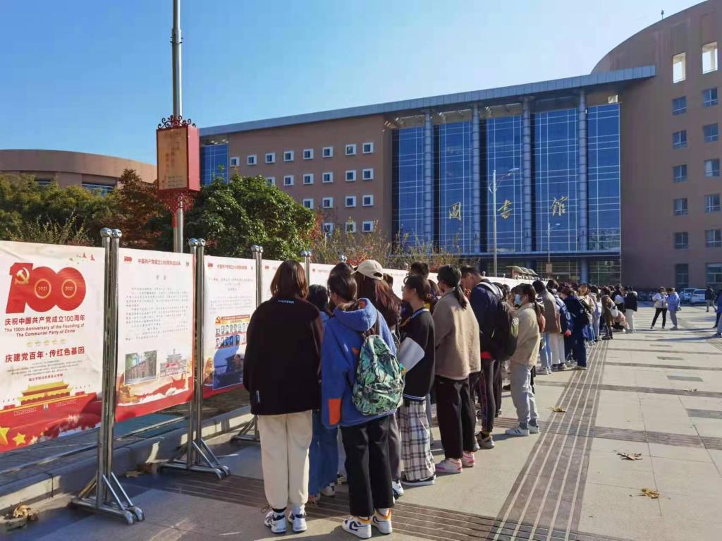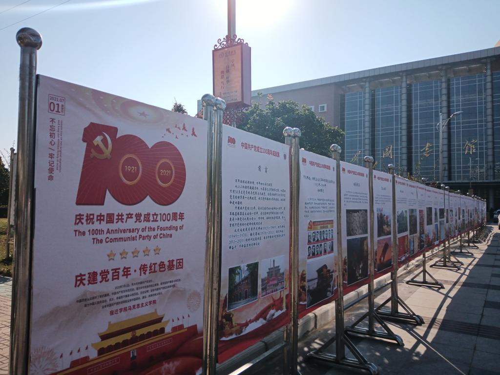 2021年思想政治教育“开学第一讲”系列活动之中国共产党百年成就图片展在新图书馆门前展出。图片展示中国共产党成立100年以来中国社会的沧桑巨变。从石库门到天安门,从兴业路到复兴路,从站起来、富起来到强起来,中国共产党与时代同步伐、与人民共命运,跨过一道又一道沟坎,取得一个又一个辉煌胜利。图片展将百年党史分为开天辟地、改天换地、翻天覆地和惊天动地4个篇章。