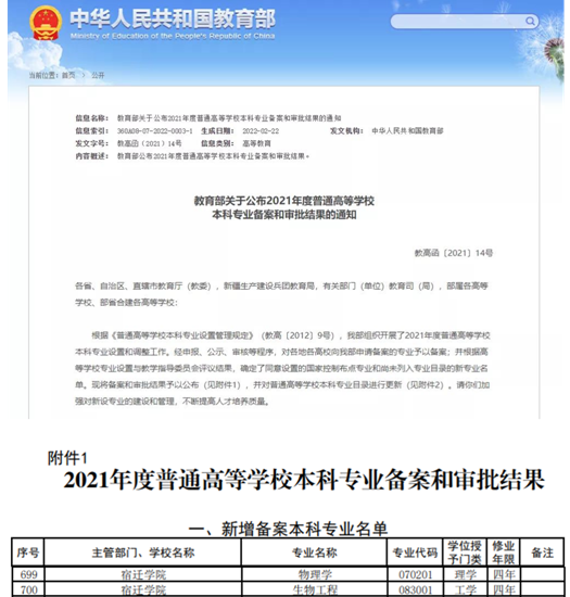 近日,教育部发布《关于公布2021年度普通高等学校本科专业备案和审批结果的通知》(教高函[2021]14号),我校申报的物理学和生物工程2个本科专业全部获批为新增备案本科专业。