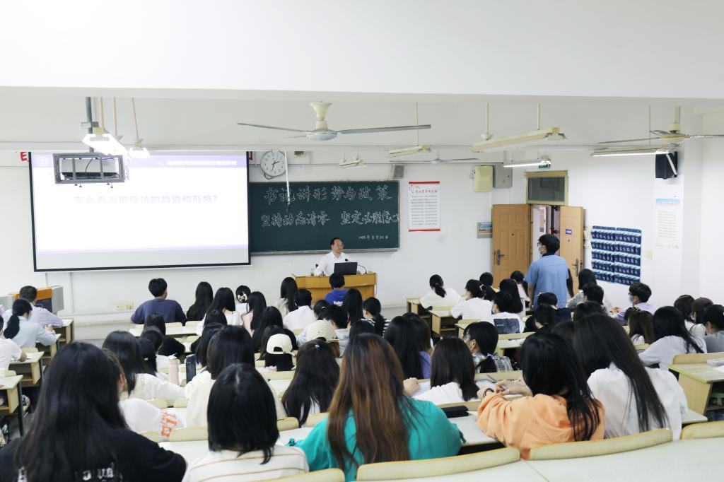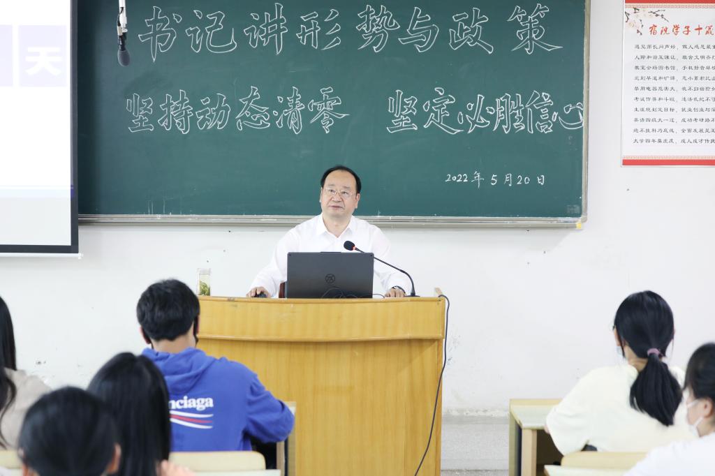 校党委书记徐德在2204教室为同学们作“坚持动态清零 坚定必胜信心——理性看待疫情防控形势和我国防控政策”的形势与政策主题讲座。他围绕如何研判当前新冠疫情的趋势、如何看待我国“动态清零”防控政策、如何做好校园疫情防控工作,与大家交流,希望广大师生提高思想认识,坚决做到“五个到位”,严把“三个关口”,并且向大家提出四点倡议,确保自身和家人的健康,筑牢校园疫情防控防线。
