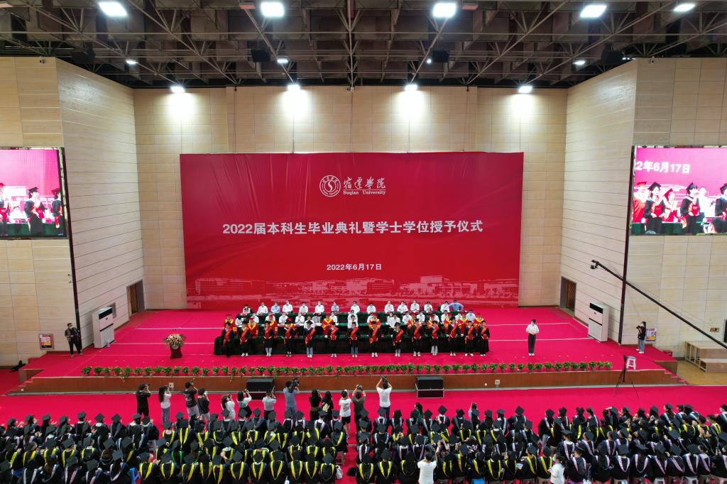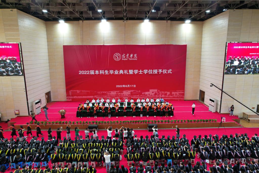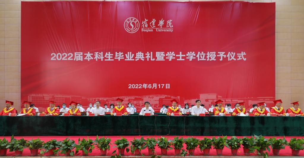 草木华滋,万物生辉;致敬青春,收获成长。在喜迎建校20周年之际,6月17日上午,我校在体育馆主馆举行2022届本科生毕业典礼暨学士学位授予仪式,共同见证4075名毕业生圆满完成学业,踏上人生新征程。宿迁市人民政府市长陈忠伟,副市长闫辉,市政府党组成员、秘书长骆志弘,全体校领导出席活动并为受表彰学生代表颁奖;全体校领导为毕业生代表拨流苏。校党委书记徐德主持活动并寄语莘莘学子,校长刘志远致辞,校党委副书记顾晓虎宣读《关于表彰2022届优秀毕业生的决定》《关于向鲁丹等同学颁发“求索奖”的决定》,校党委常委、副校长丁红燕宣读《关于授予刘添炜等3275名普通本科毕业生学士学位的决定》。
