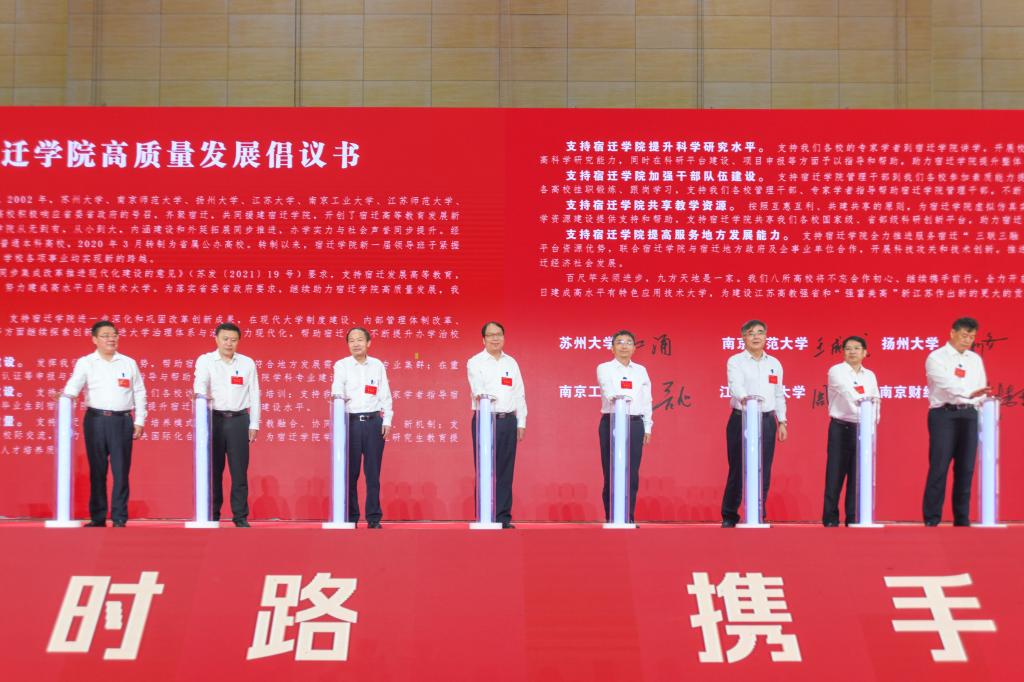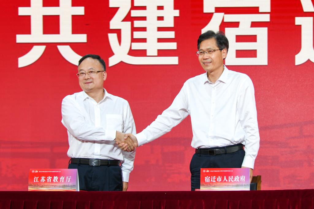 会上,省教育厅副厅长杨树兵、宿迁市政府副市长闫辉共同签订《江苏省教育厅宿迁市人民政府共建18新利luck菲律宾 协议》。共建协议中,最具分量的一个重大项目是计划投资60亿元建设占地2600亩、建筑面积60万平方米的新校区。在不久的将来,集绿色、生态、智慧、开放、平安于一体的现代化美丽校园将在骆马湖畔拔地而起。