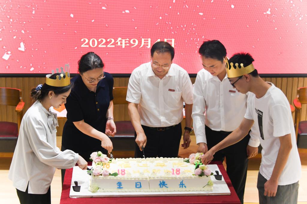 9月4日下午,我校为9月3日、9月4日出生的大一新生举办集体生日会。校党委书记徐德、副校长侍旭为小寿星们戴生日帽,赠生日礼品,唱生日歌,切生日蛋糕,送生日寄语。