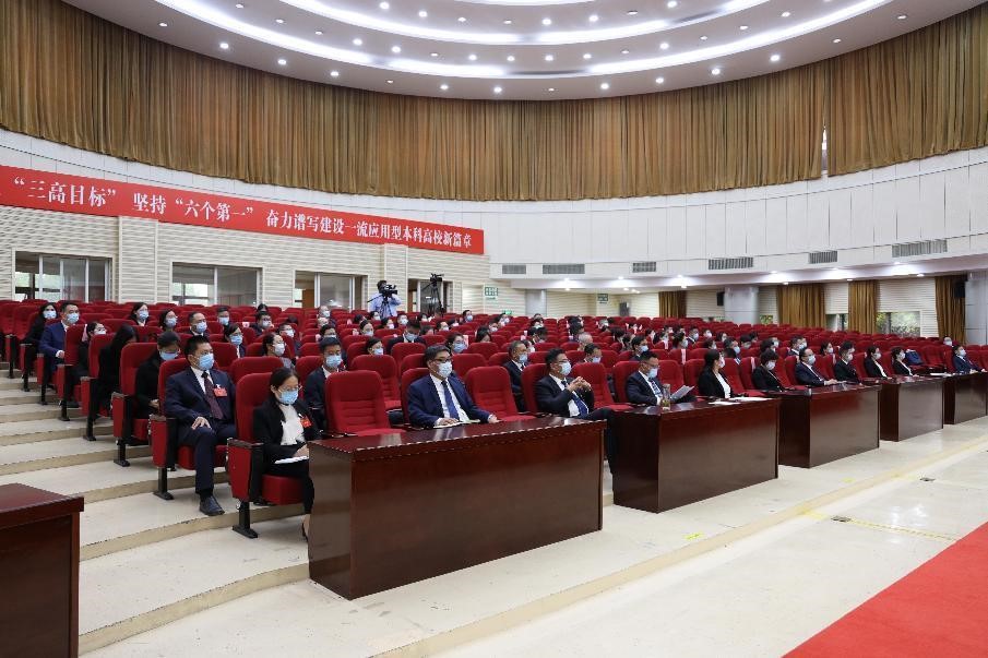 第一届委员会作了题为《聚焦“三高”目标 坚持“六个第一”奋力谱写建设一流应用型本科高校新篇章》工作报告,大会的主题是:高举中国特色社会主义伟大旗帜,以习近平新时代中国特色社会主义思想为指导,回顾总结学校第一次党代会以来的各项工作,研究部署今后五年奋斗目标和主要任务,动员全校各级党组织、全体共产党员和广大师生员工,聚焦“三高目标”,坚持“六个第一”,奋力谱写建设一流应用型本科高校新篇章。