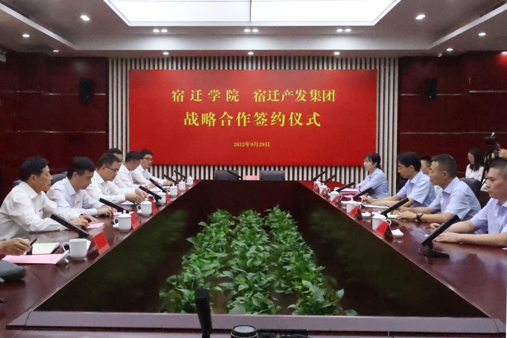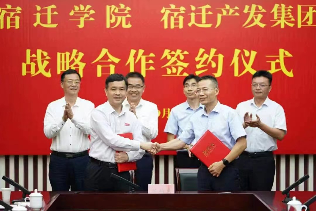 服务宿迁“三联三融”十大星火计划,推动校地深度合作与共同发展,9月29日下午,我校举行与宿迁产发集团战略合作签约仪式。校长潘志明,宿迁产发集团党委书记、董事长杨卫国参加活动并致辞,仪式由纪委书记刘立新主持。副校长郭照冰,宿迁产发集团党委副书记、监事会主席许有恒和党委委员、副总经理冒酉飞参加签约仪式。