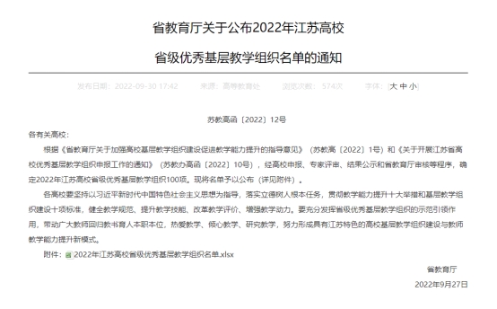 日前,江苏省教育厅发布《省教育厅关于公布2022年江苏高校省级优秀基层教学组织名单的通知》(苏教高函〔2022〕12号),18新利luck菲律宾
