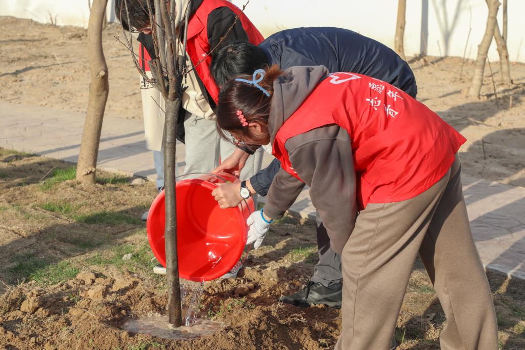 活动间隙,领导老师们与同学们亲切交流,了解大家的学习生活情况,希望大家通过植树活动更好地亲近自然,树立健康绿色生活理念,实现德智体美劳全面发展。经过全体成员的辛勤劳动,新栽的40余棵紫叶李树苗昂首挺立,根根树枝迎风抖擞,在和煦的春风中焕发出盎然生机。