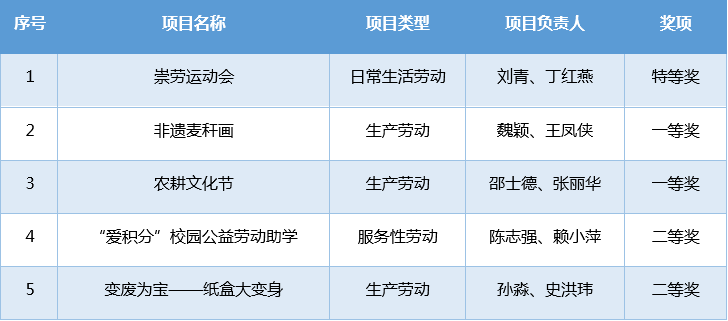 近日,江苏省高等教育学会发布2022年江苏省高等学校劳动教育优秀实践项目评选结果。我校申报的5个项目全部获奖,其中,刘青、丁红燕《崇劳运动会》项目获特等奖,魏颖、王凤侠《非遗麦秆画》和邵士德、张丽华《农耕文化节》2个项目获一等奖,陈志强、赖小萍《“爱积分”校园公益劳动助学》和孙淼、史洪玮《变废为宝——纸盒大变身》2个项目获二等奖。