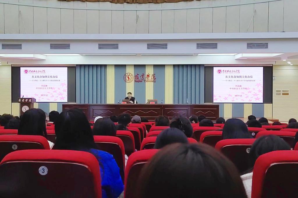 李道湘教授讲座围绕“学习贯彻二十大精神,推进文化自信自强”“从宿迁文化的自知谈谈中华文化的自知”“从中华文化自知到中华文化自信深入”等方面展开。李教授以习近平总书记的中华文化情怀为例,强调弘扬中华优秀传统文化,从中汲取智慧,建立文化自信。他鼓励大家身在宿迁,要学好宿迁历史文化,讲好宿迁文化故事。他强调,文化自知是文化自信的前提,爱国主义、忧患意识、自强不息精神、和合精神等具有悠久历史文化底蕴,并对世界产生深远影响。师生们听后表示收获丰厚,要深入学习中华优秀传统文化与地方文化,以实际行动提升文化自信自强,铸就中华文化新辉煌。