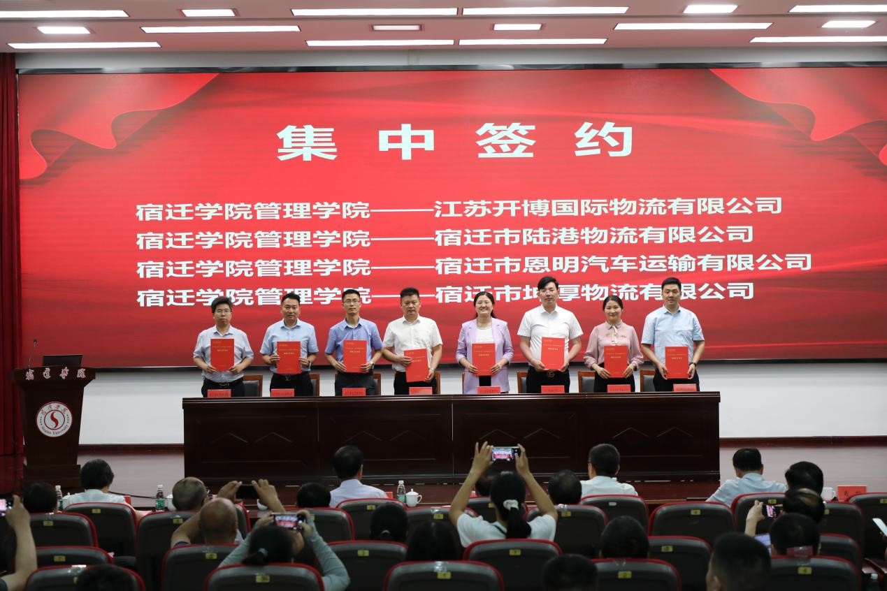 活动现场,潘志明校长、马健副会长共同为“智慧物流与供应链产学研基地”揭牌;江苏健安物流有限公司代表企业发布需求;江苏开博国际物流有限公司、宿迁市陆港物流有限公司、宿迁市恩明汽车运输有限公司、宿迁市坤厚物流有限公司部分企业与管理学院签订项目协议。