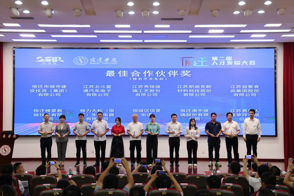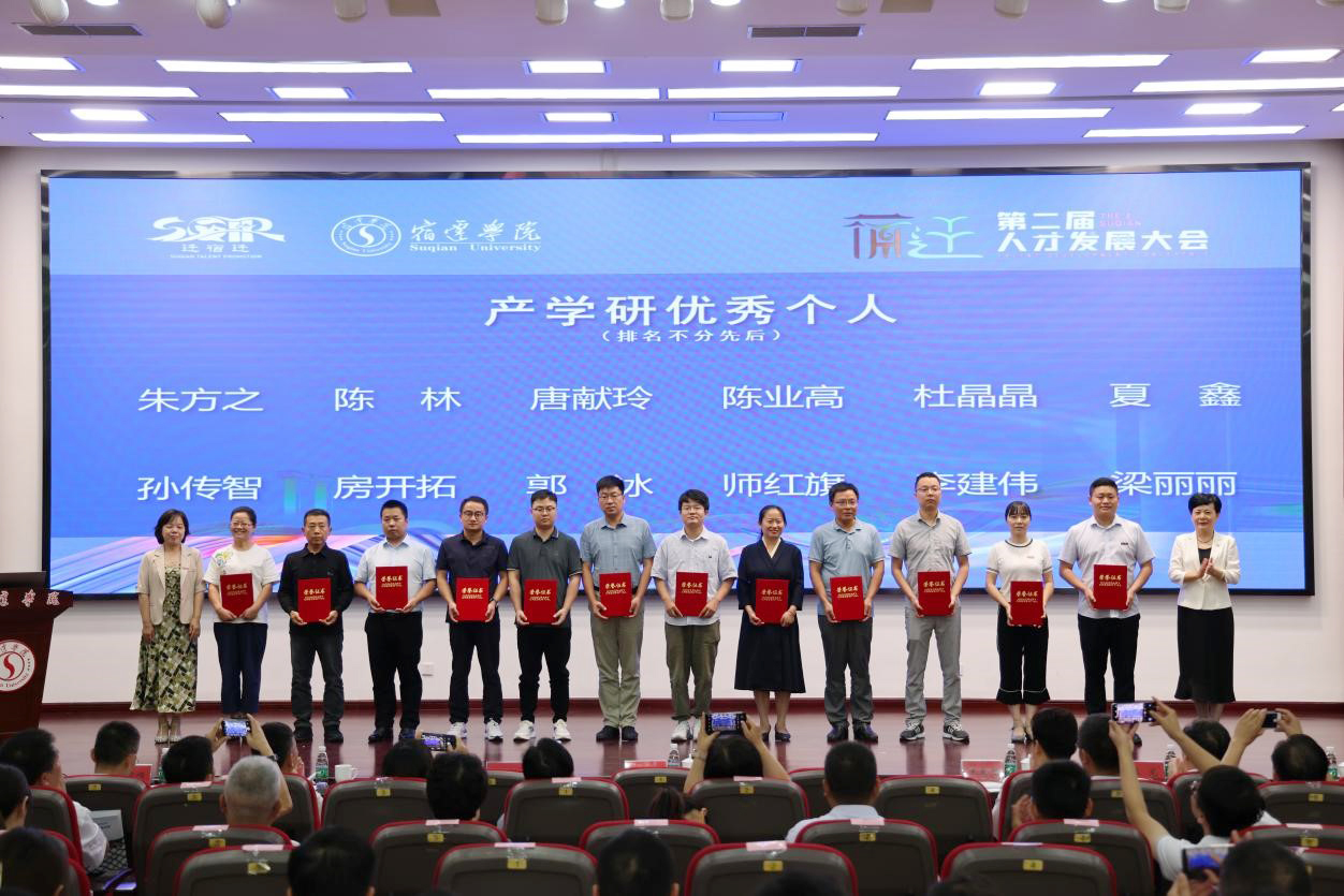 大会为宿迁市城市建设投资(集团)有限公司、江苏北斗星通汽车电子有限公司、江苏秀强玻璃工艺股份有限公司、江苏斯迪克新材料科技股份有限公司、江苏益客食品集团股份有限公司、宿迁棱星数据技术有限公司、格力大松(宿迁)生活电器有限公司、宿城区项里街道、宿迁澳中玻璃股份有限公司、江苏易华人造草坪有限公司等10家单位颁发了最佳合作伙伴奖;为朱方之、陈林、唐献玲、陈业高、杜晶晶、夏鑫、孙传智、房开拓、郭冰、师红旗、李建伟、梁丽丽等12人颁发了产学研优秀个人奖。