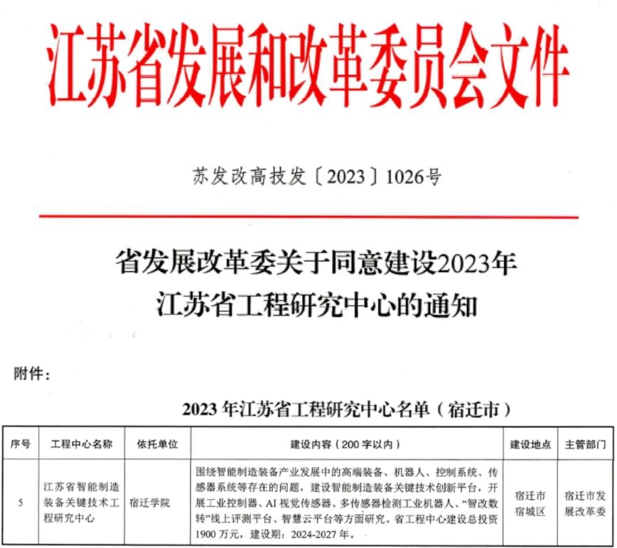 日前,江苏省发展和改革委员会下发《省发改委关于同意建设2023年江苏省工程研究中心的通知》,我校机电工程学院申报的“江苏省智能制造装备关键技术工程研究中心”成功获批。