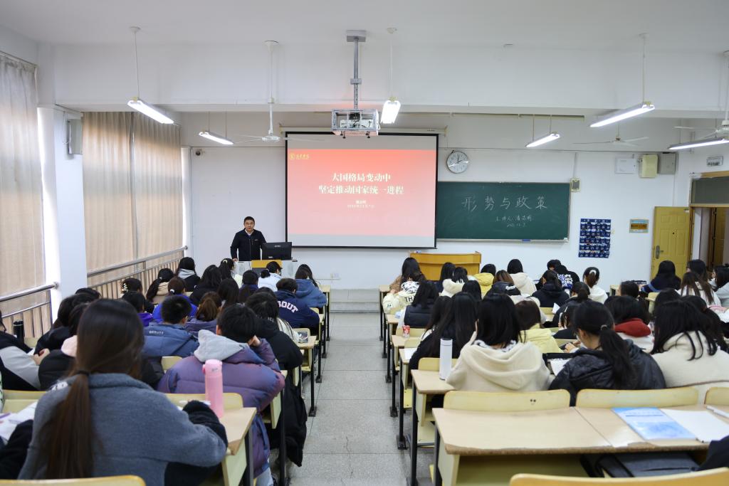 为全面贯彻党的二十大精神,推进“形势与政策”课程教育教学改革,充分发挥校领导讲思政课的示范引领作用,12月7日下午,校长潘志明以“大国格局变动中坚定推动国家统一进程”为主题,给文理学院22小教1班、22小教2班学生带来了一堂内容丰富、生动深刻的思想政治理论课。