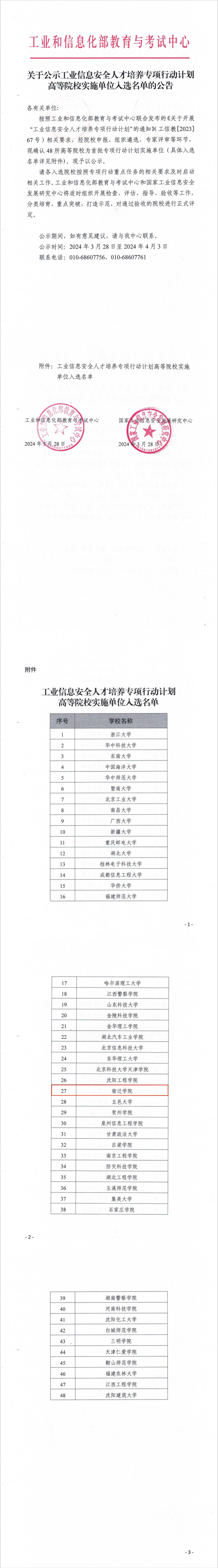 日前,工业和信息化部教育与考试中心公布了首批“工业信息安全18新利luck客服 专项行动计划”的入选单位名单,我校成功入选首批专项行动计划实施单位,申报主体为信息工程学院计算机科学与技术和物联网工程专业为主的专业群。全国共48所高校入选首批专项行动计划,在江苏省高校中,我校与东南大学、南京工程学院、金陵科技学院等4所院校同批入选。