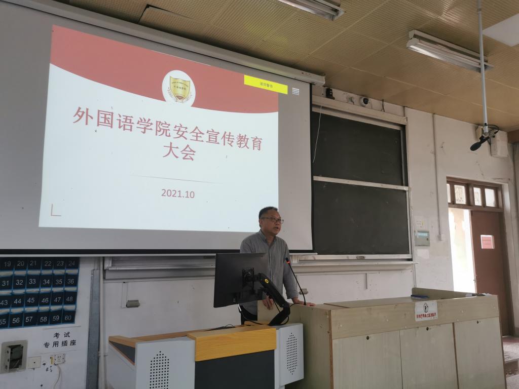 10月6日下午,外国语学院在四阶召开安全宣传教育大会,特邀保卫处负责人就消防安全作专题培训。会议由外国语学院党委书记管志强主持,全体教职工参加。
