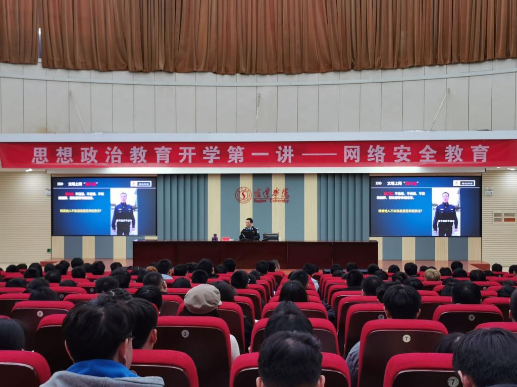 宿迁市公安局网络安全保卫支队大队长魏鑫分别从网络交友陷阱、网络求职陷阱、网络购物陷阱及其他网络陷阱诈骗四个方面进行分析讲解,通过生活中真实的案例,引导大家要提高法治意识,增强自我防护意识和能力。