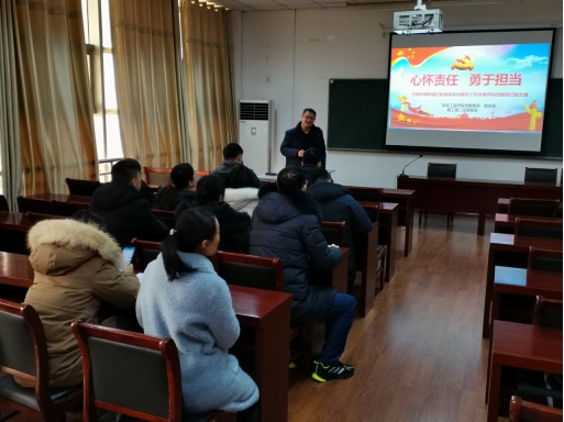 12月17日上午,机电工程学院党委委员、副院长唐友亮,为教师第三党支部全体党员,做了题为《心怀责任勇于担当——为我校顺利通过教育部本科教学工作合格评估贡献自己的力量》的专题党课。党课上,唐友亮副院长通过百年党史中“责任与担当”的含义开题,强调“坚定理想信念,不忘初心”的重要性,系统阐述了“四个意识——政治意识、大局意识、核心意识、看齐意识”的具体内涵,举例剖析了党员“担当底气”的历史性和延续性。党课的落脚点回归到“心怀责任勇于担当 做合格的党员”,面对本科教学工作合格评估,党员教师应该发挥先锋模范作用,党支部发挥战斗堡垒作用。
