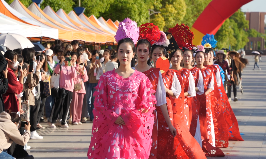 王康负责走秀部分的拍摄,走秀需要展示同学们用剪纸制成的大红袍及用报纸制成的环保服,同时还有粽叶和秸秆制成的作品挂件。照片需要展示每个作品的细节。走秀的同学缓缓走向舞台,王康用明媚的阳光作为自然光线,以前侧光的选用进行构图,前测光照射的人物富有生气和立体感。