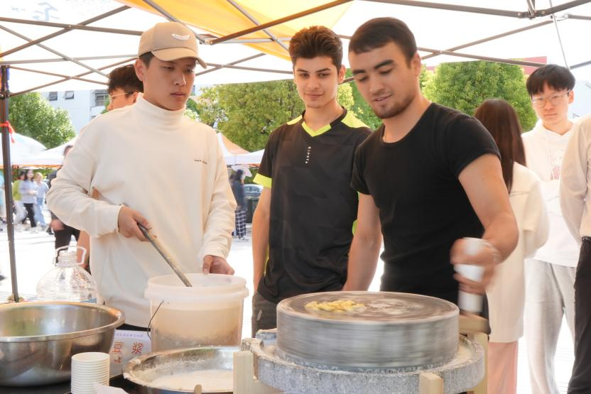 邓余彬在实践区进行拍摄,实践区的拍摄需要注意光质的因素。观展同学十分热情,聚集在各个实践点桌子前,想要拍摄出良好的照片需要调整拍摄的角度,不能背光也不能太聚光。实拍过程中的动态需要表现出来,更要注意快门速度和光圈的大小。例如这张记录磨豆浆的照片,光比不能过大,需要柔和的光。
