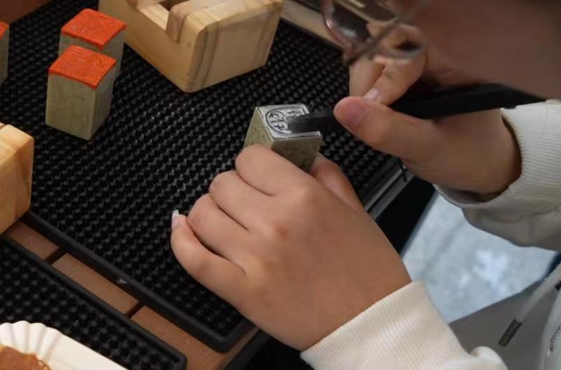夏子馨在乡村非遗区拍摄。篆刻的同学们专心致志,屏气凝神制作手里的作品。自然光的光比大,色调应当以暖色调为主,白天的日景,光比小,光线跳跃,桌子的黑色和浅色的印章石进行对比,影调比较暗淡,需要表现化用光。
