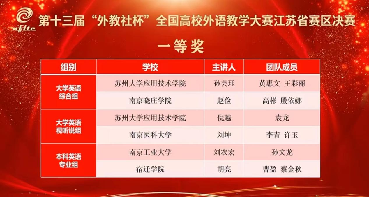在10月22日结束的第十三届“外教社杯”全国高校外语教学大赛江苏省赛区决赛中,我校外国语学院胡亮团队以优异表现获得本科英语专业组一等奖,再次展现了18新利luck菲律宾 青年教师深厚的教学理论积淀和扎实的教学基本功。