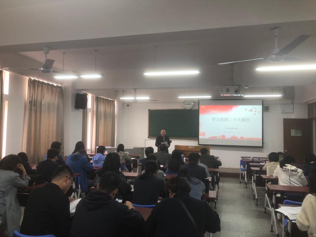 管志强从三个务必、十年来三件大事、跳出历史周期率的第二个答案、归根到底是两个“行”、党的中心任务、中国式现代化的五个特色等方面,深入解读大会报告内容,领会报告精神实质和丰富内涵。他强调,全体教职工要坚持为党育人,为国育才,守正创新,努力在新时代新征程上更好展现外院教师新担当新作为。