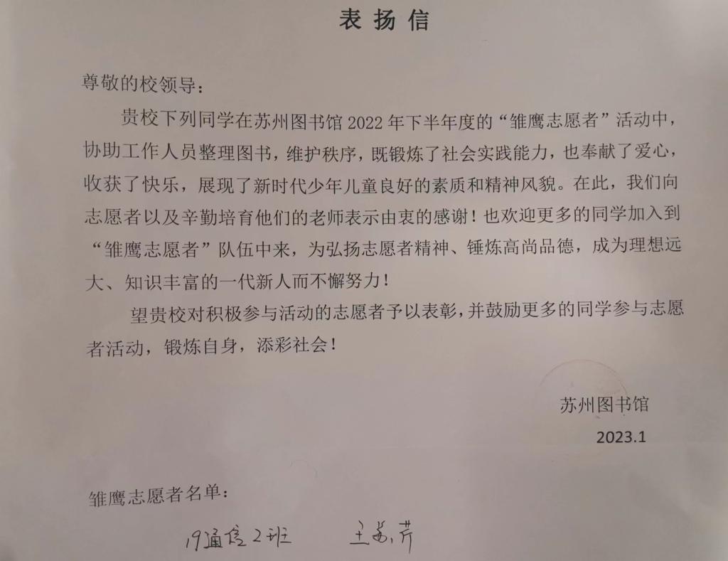 原来,王苏芹同学在苏州图书馆2022年下半年度的“雏鹰志愿者”活动中,协助工作人员整理图书、维护秩序,展现了当代大学生良好的素质和精神风貌,苏州图书馆专门向我校和老师表示感谢。王苏芹同学表示,志愿服务既锻炼了社会实践能力,也奉献了爱心。