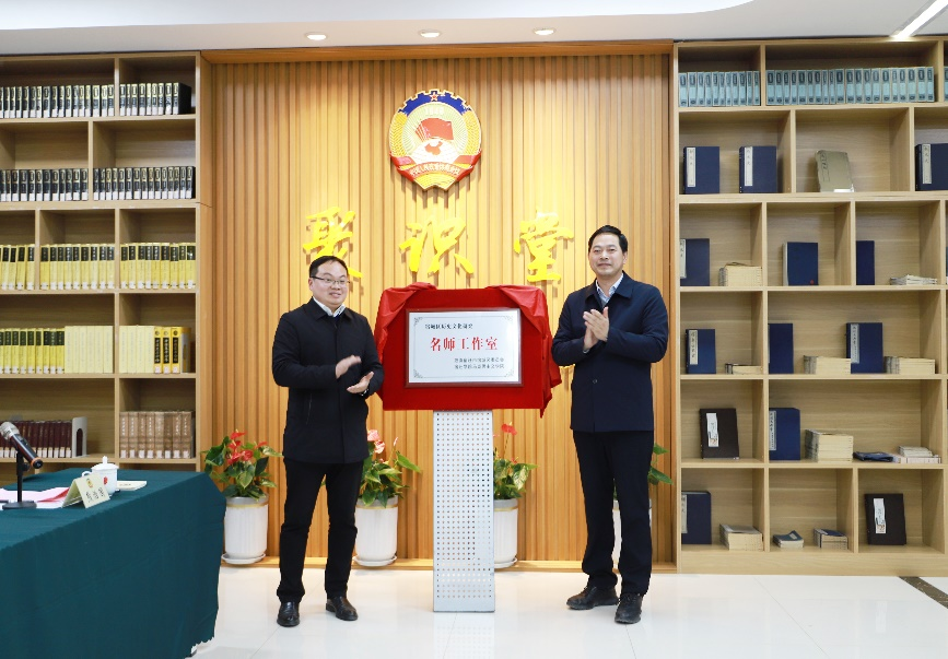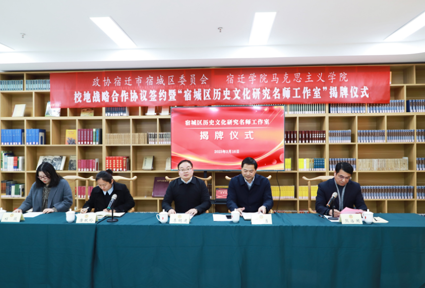 仪式上,李明建常委与施勇主席代表双方为“宿城历史文化研究名师工作室”揭牌。唐献玲副院长代表马院与宿城区政协、图书馆、博物馆签订战略合作协议。