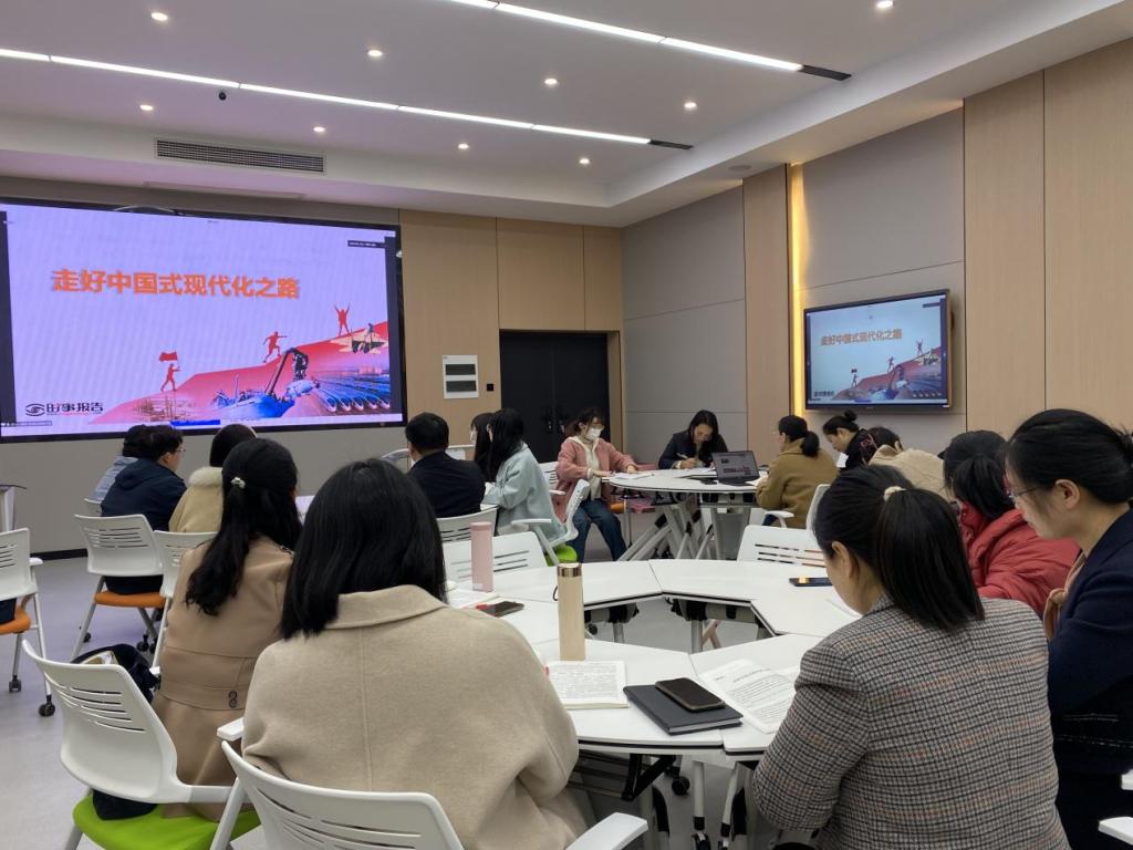 张良老师从历史之维——现代化是中华民族千年以来孜孜以求的梦想;现实之基——中华民族伟大复兴进入不可逆转的历史进程;独特之色——深刻理解和正确认识中国式现代化鲜明特色;推进之路——以中国式现代化全面推进中华民族伟大复兴四个维度进行系统讲授。精炼的授课语言,严谨的教学结构,深入的理论阐释引发全场教师阵阵掌声。讲座结束后,就专题内容,全体教师进行了交流与研讨。