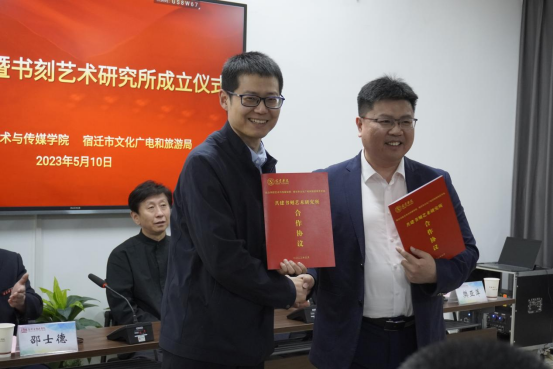 会上,宿迁文广旅局艺术处处长吴佳佳与艺传院杨柳松老师代表合作双方签约;吴佳佳处长和邵士德副院长共同为书刻艺术研究所成立揭牌。研究所的成立将进一步深化校地合作,充分发挥双方在人才、技术、项目和成果等方面的优势,实现校地互融互通、合作共赢。