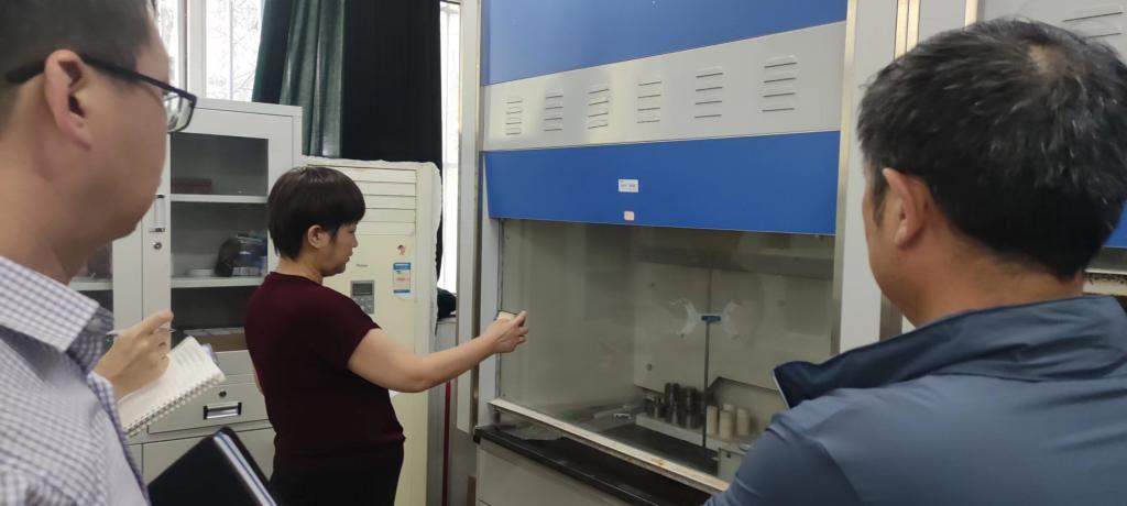 随后,检查组随机抽取20个实验室,分两组深入化学试剂贮藏室、化学废液暂存室及部分材料、化学、园林、机电实验室,对实验场所、消防设施、化学品安全、用电安全、管制类试剂使用管理与台账、试剂购置与存储、实验室废液回收与处置、特种设备使用管理与安全培训等进行了细致的现场检查与指导,教务处等职能部门、相关学院分管院长以及实验室管理人员现场陪同检查。