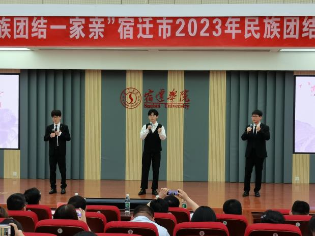 校党委常委、宣传部部长、马克思主义学院院长李明建致欢迎辞。他指出,师生一是要积极参与中华民族共同体建设活动,铸牢中华民族共同体意识,构建起维护国家统一和民族团结的坚固思想长城。二是要丰富活动形式,深化大学生心中对中华民族共同体意识的认知理解。三是要将民族团结进步教育作为大学生思政教育重要内容,在教科研中加以落实。宿迁市民宗局副局长郑卫兵表示,宣传月活动旨在推进各族人民进一步筑牢中华民族共同体意识,共同团结奋斗,共同繁荣发展。