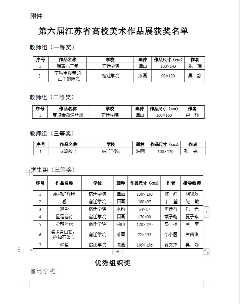 第六届江苏省高校美术作品展由省教育厅主办,共收到全省122所高校投稿作品4124件,作品种类涵盖国画、油画、版画、漆画、雕塑、插画、壁画、水粉、水彩等画种。经过专家组遴选,评出一等奖作品49件,其中教师组 20件、学生组29件;二等奖作品98件,其中教师组30件、学生组68件;三等奖作品530件,其中教师组135件,学生组395件。