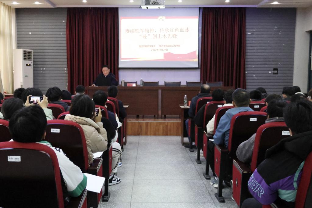 为充分发挥红色资源的育人作用,建筑工程学院教师第一党支部、学生第一党支部11月29日下午联合开展“赓续铁军精神,传承红色血脉,‘砼’创土木先锋”主题党日活动。活动邀请宿迁市新四军学会会长孙其松作专题报告,建工院党委书记郭振宇、院长朱方之参加会议,两个支部的党员及铁军班学生参加活动。活动由副院长蒋连接主持。