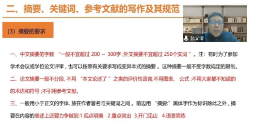 孙义清结合自身多年学术研究和编审经历,从学术论文的写作与投稿要求、摘要撰写、关键词设置、参考文献规范、写作与投稿的常见问题、淮阴师范学院学报投稿须知等方面进行详细指导。在互动环节,孙义清详细回答了教师在文章撰写过程中遇到的引用文献查重率高、逻辑框架不清晰、问题意识不强、学术性语言风格等疑问。