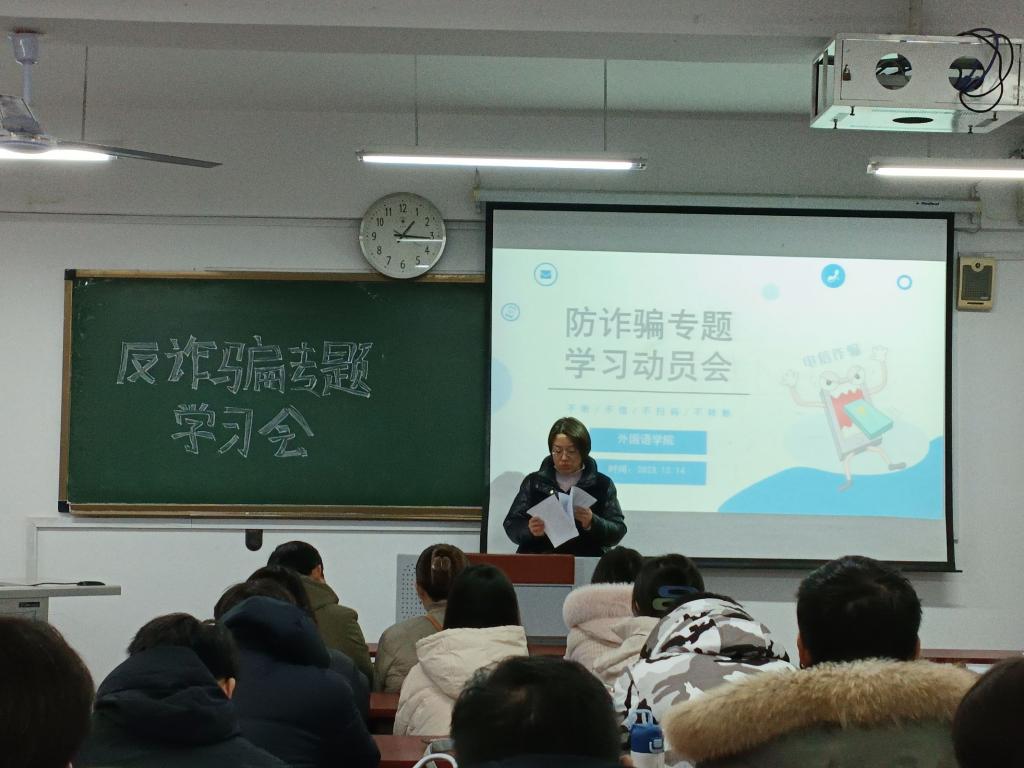 12月14日,外国语学院组织召开防诈骗工作推进会暨学习培训会,院党委副书记王倩、全体辅导员及各班安保委员参会。