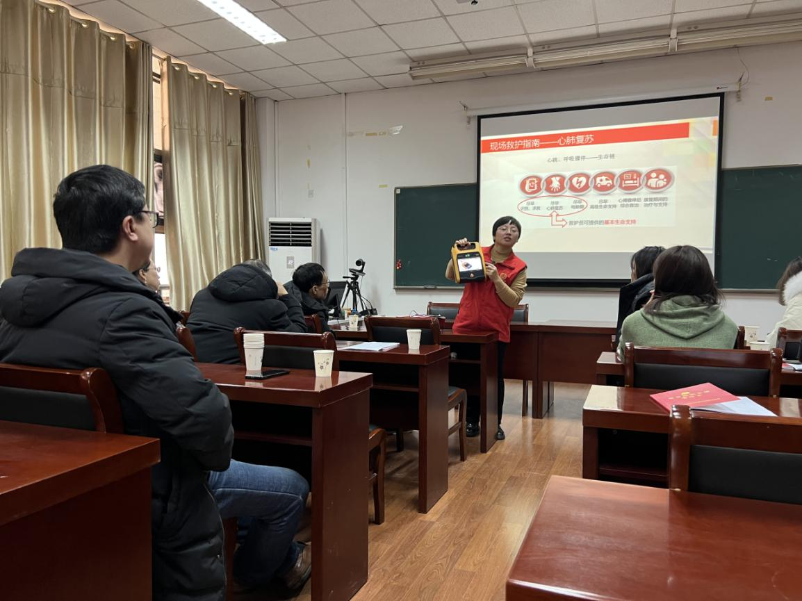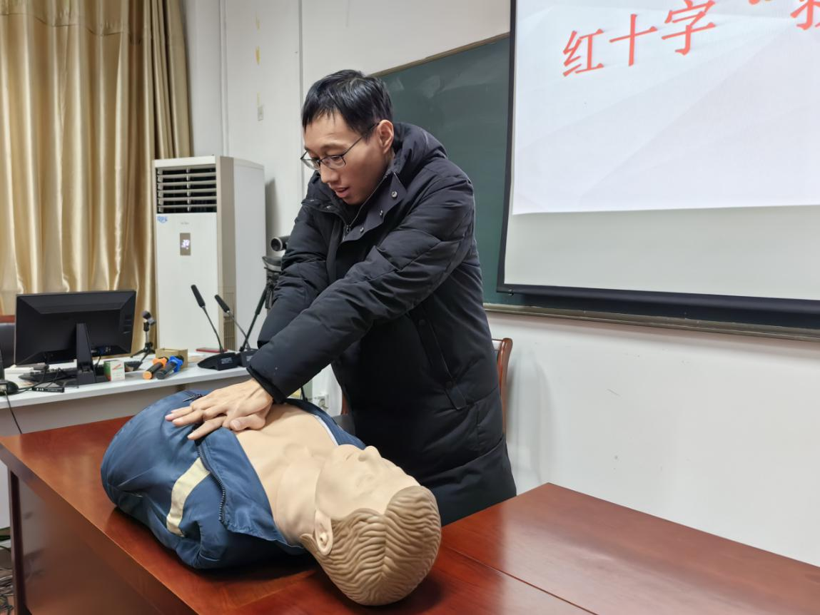 本次讲座培训从触电伤害、机械伤害、心肺复苏、除颤仪的使用以及海姆立克急救法等方面为大家讲解。在实操环节,授课教师现场进行急救演示,大家依次上前借助教学模拟人等器材实际演练了心肺复苏、AED体外除颤仪的使用等救护技能。