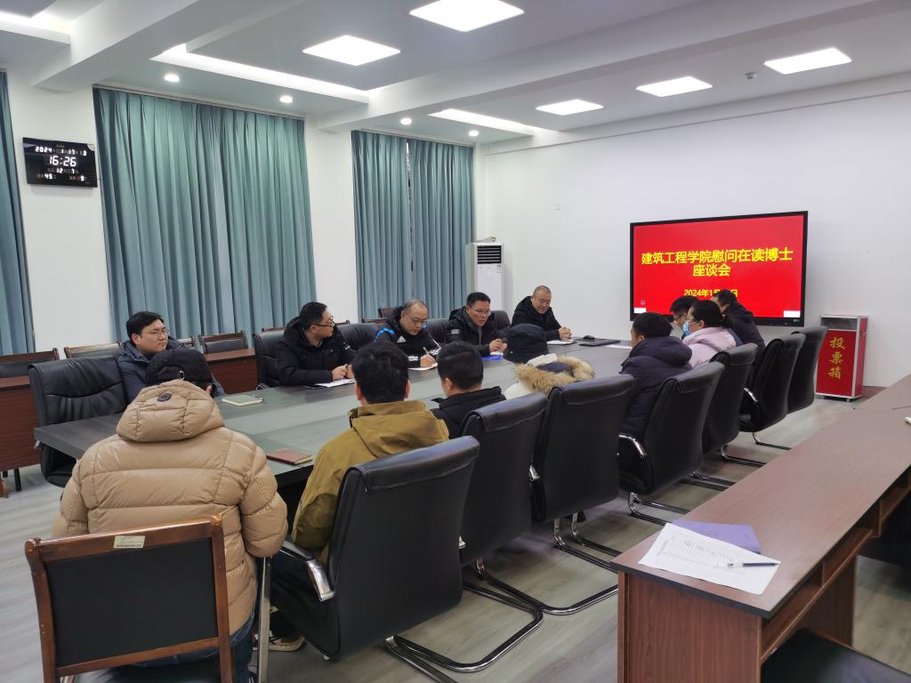 1月17日下午,建筑工程学院领导班子在学院会议室召开在读博士教师座谈会,学院党委书记郭振宇、院长朱方之、副院长孙小荣、蒋连接和在读博士教师参加座谈会,会议由院长朱方之主持。