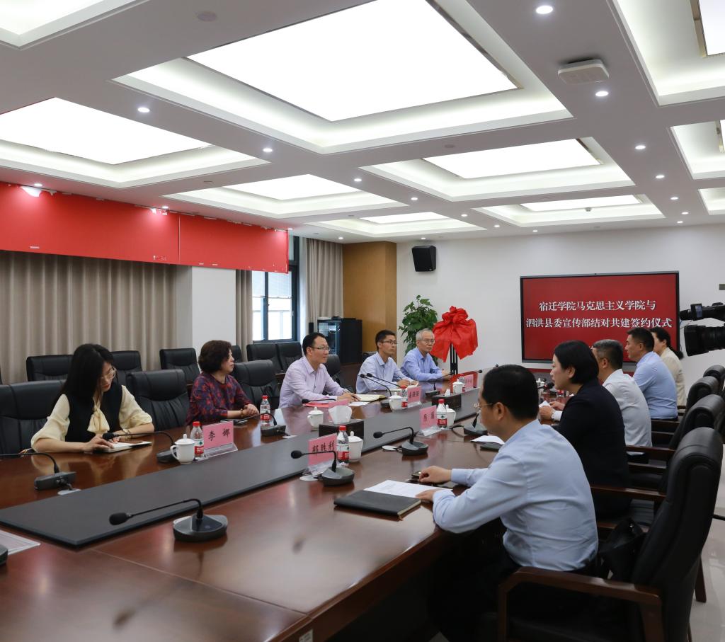 为更好地走进宿迁、融入宿迁、服务宿迁,5月14日上午,马克思主义学院与泗洪县委宣传部举行结对共建签约仪式。泗洪县委常委、宣传部部长孙建,宣传部常务副部长厉丽,泗洪县委党校常务副校长刘晓永,宣传部副部长郁胜利;马院院长姜强强、党总支副书记(主持工作)邓平安、副院长陈丽杰、李正治教授、李娜博士等参加签约仪式。