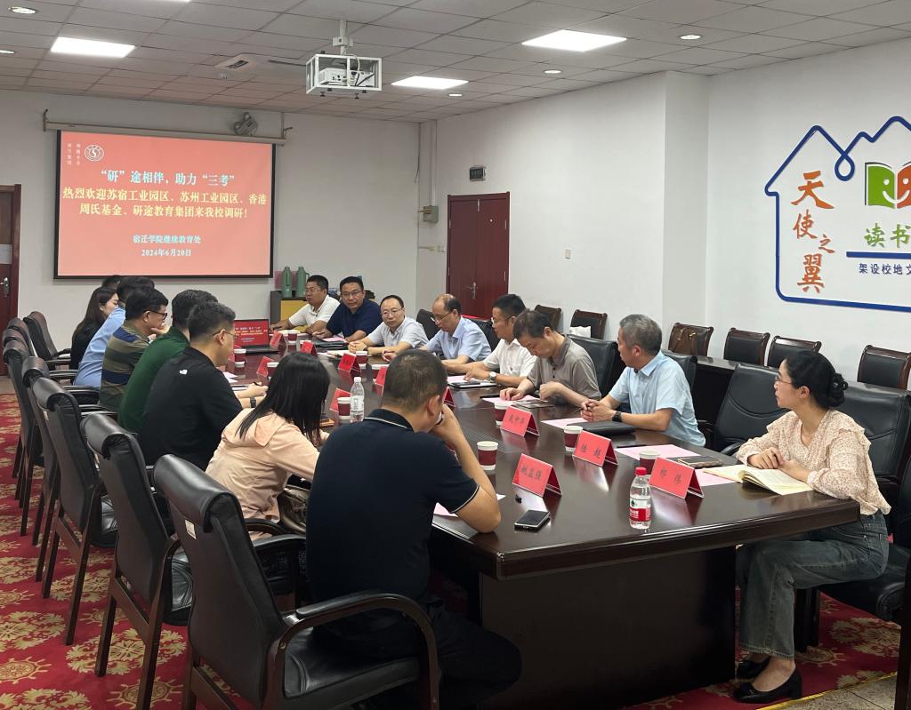 6月20日下午,苏宿工业园区招商与经济发展局副局长韦海栋,苏州工业园区管委会教育局调研员、工会主席许绍杰,研途教育集团总裁康力、常务副总裁孔军,香港周氏基金项目代表李晓敏一行来我校调研交流,继续教育处处长张进、图书馆副馆长杲亮、继续教育处相关科室负责人参加座谈。